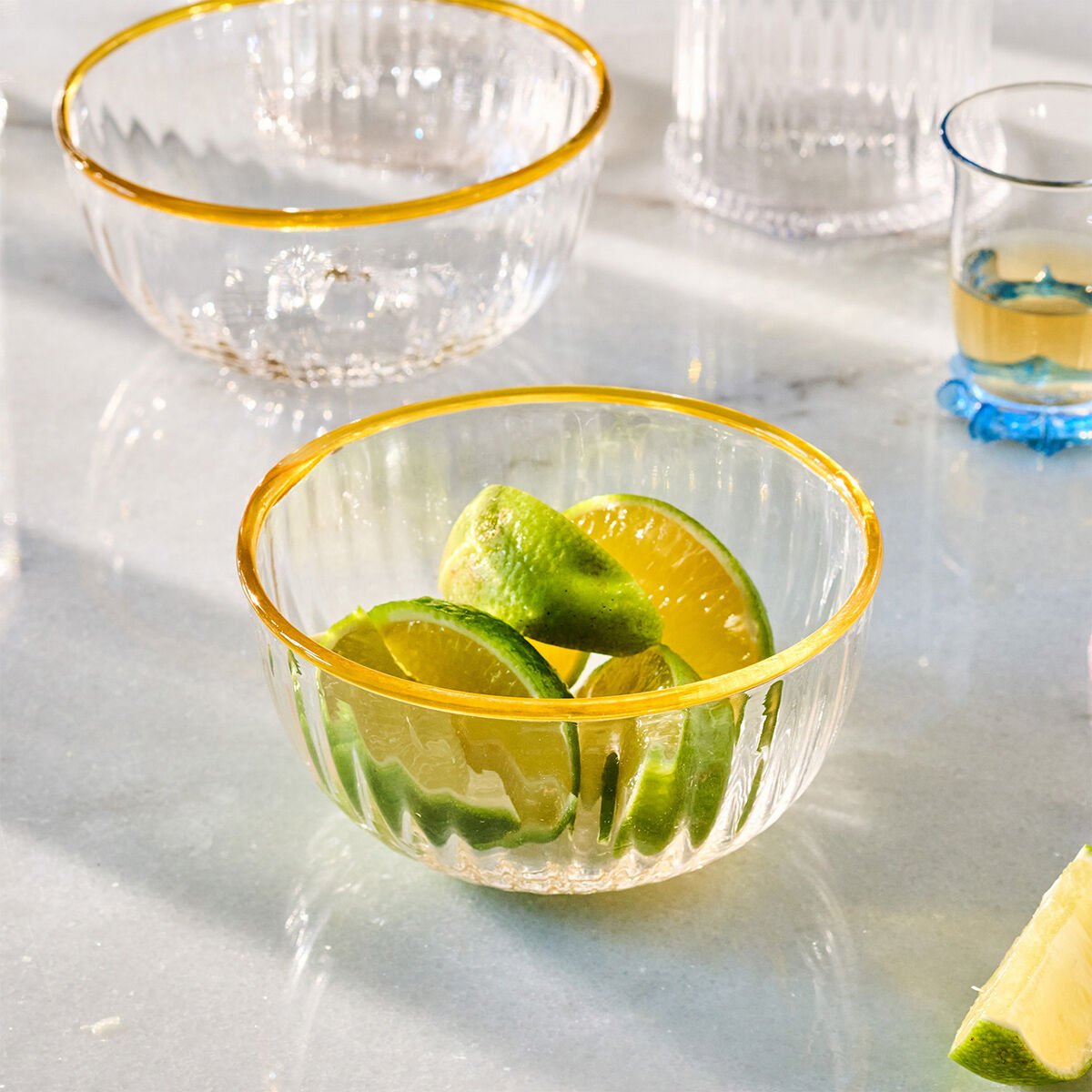 Çek Cumhuriyeti'ndeki usta zanaatkarların ellerinde hayat bulan bu şık küçük kaplar, geleneksel üfleme cam sanatını modern bir estetikle birleştiriyor. İnce işçilikle şekillendirilen cam dokusu, kenarlarındaki neşeli renk detayıyla sofranıza enerji ve zarafet katmak için tasarlandı.